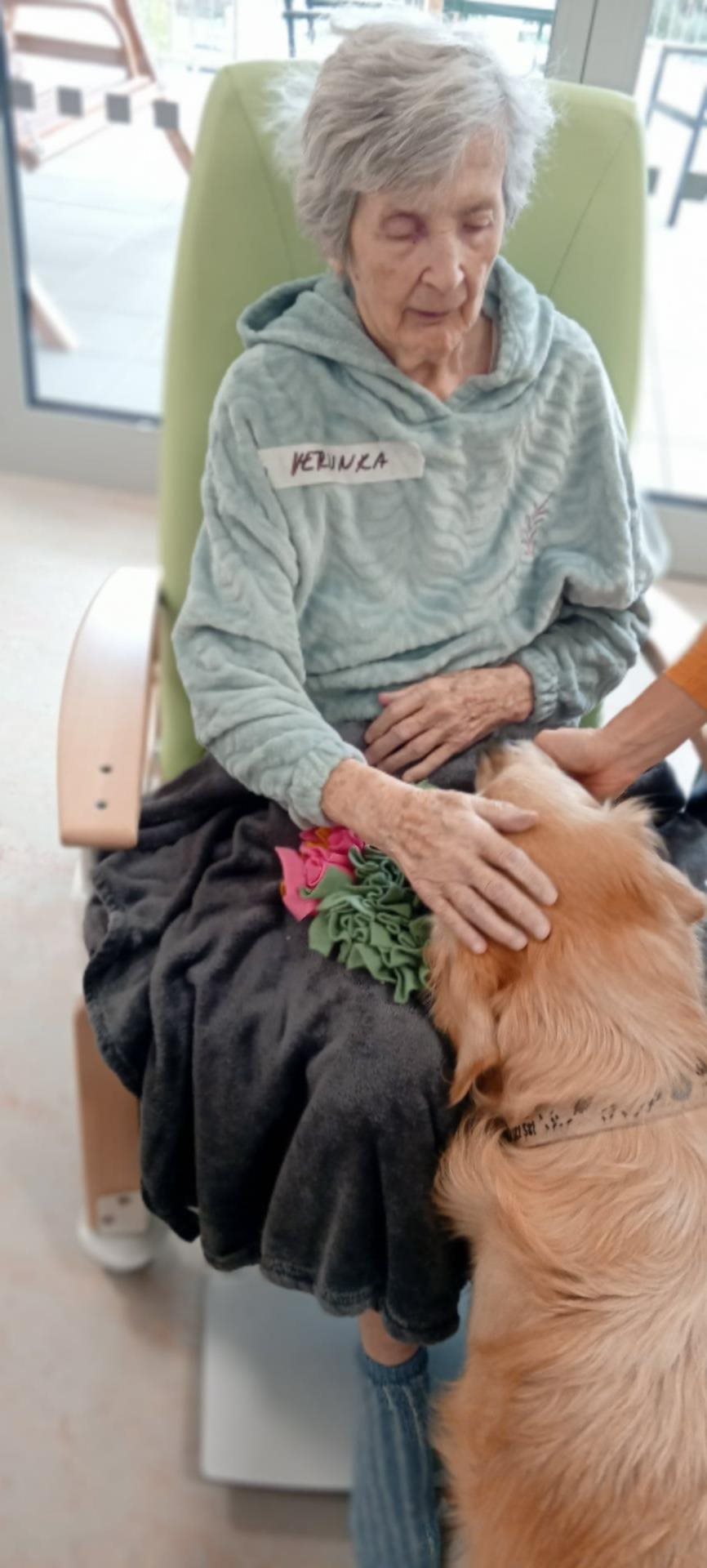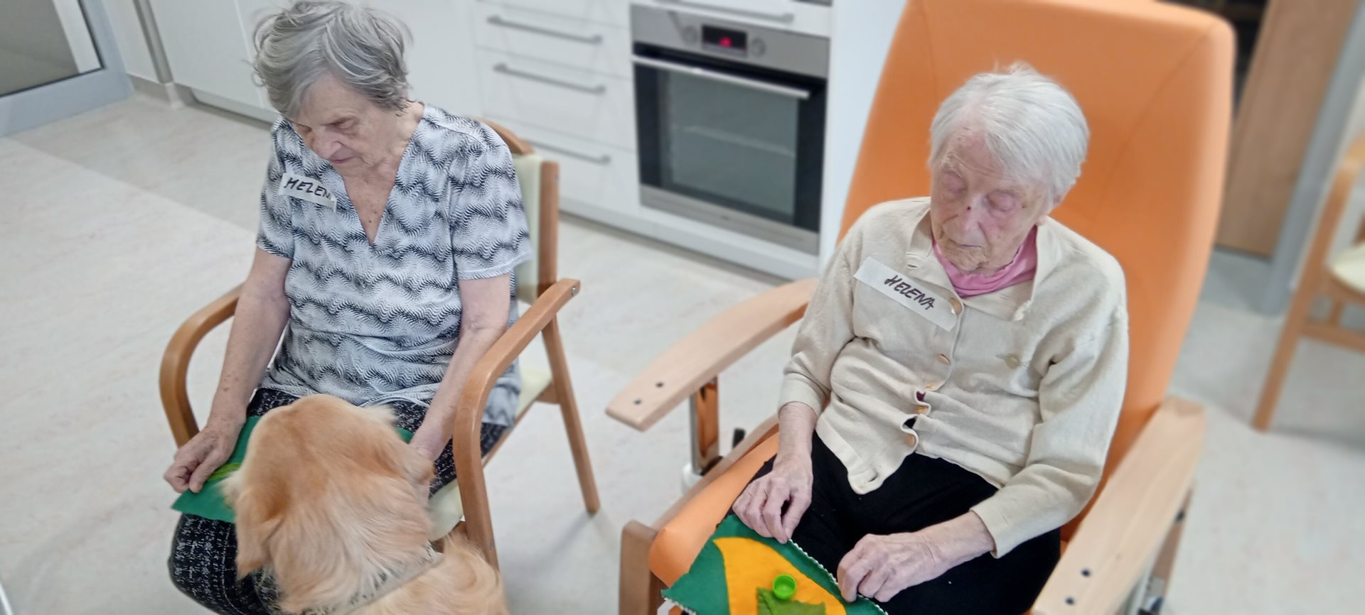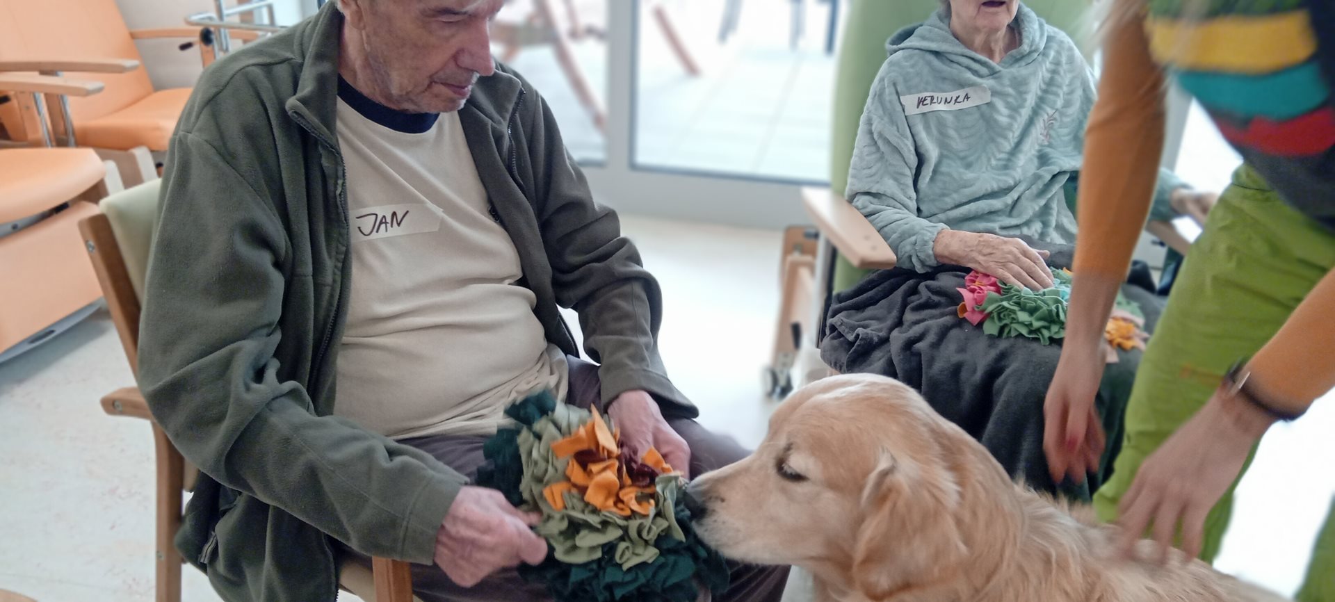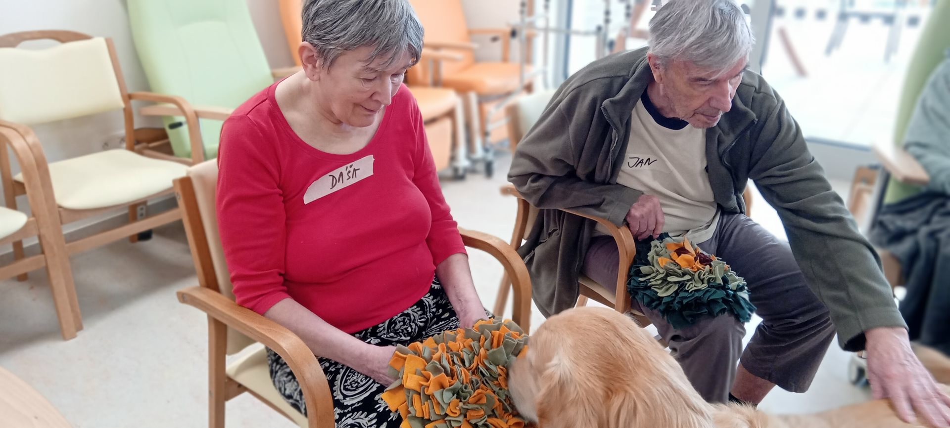 Během aktivit si klienti procvičovali jemnou motoriku, vzpomínali na svá zvířata a užívali si přítomnost psího kamaráda, kterého si rádi pohladí a nakonec ho i krásně učešou.