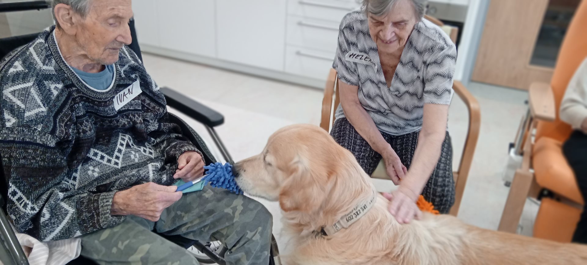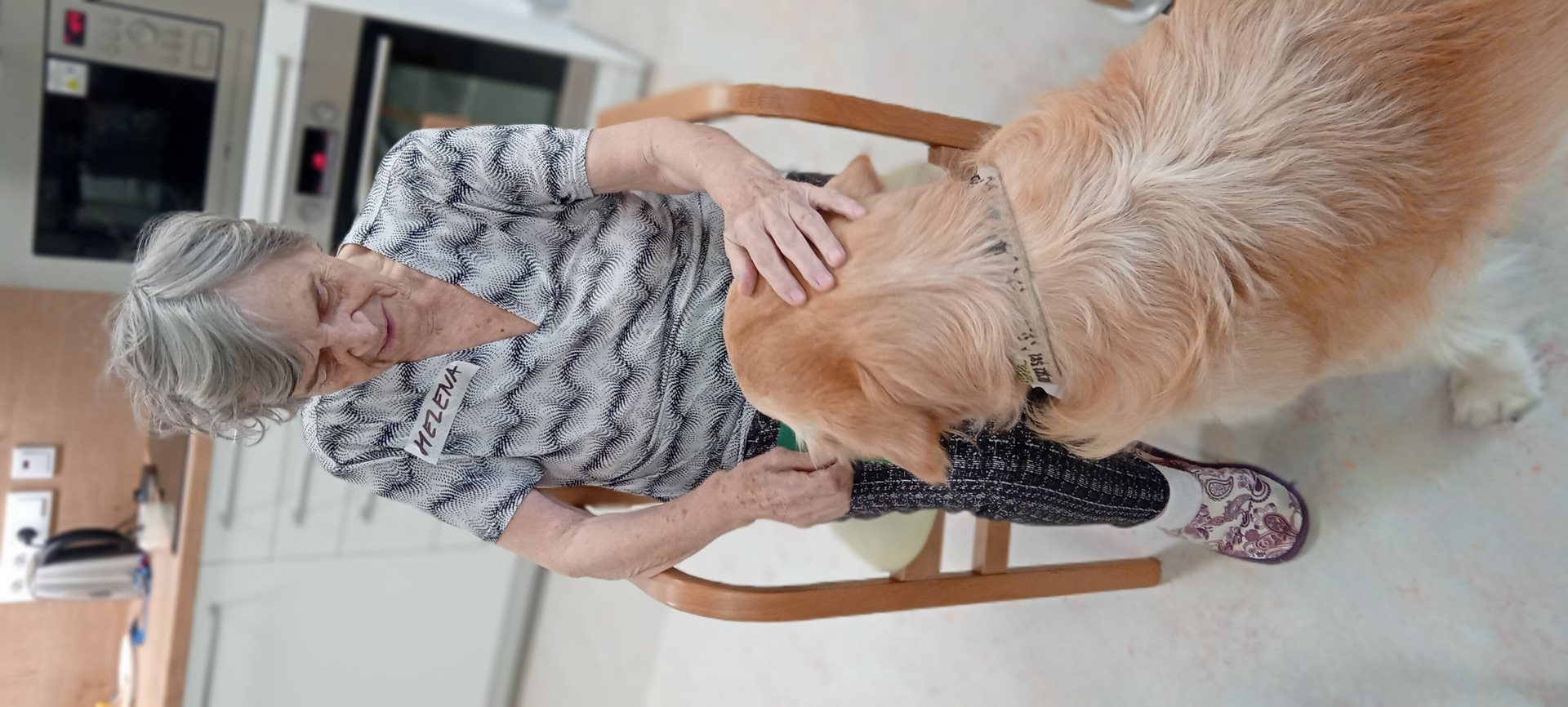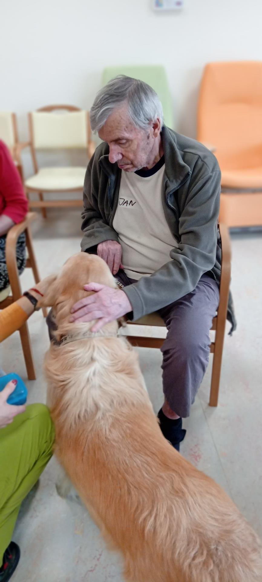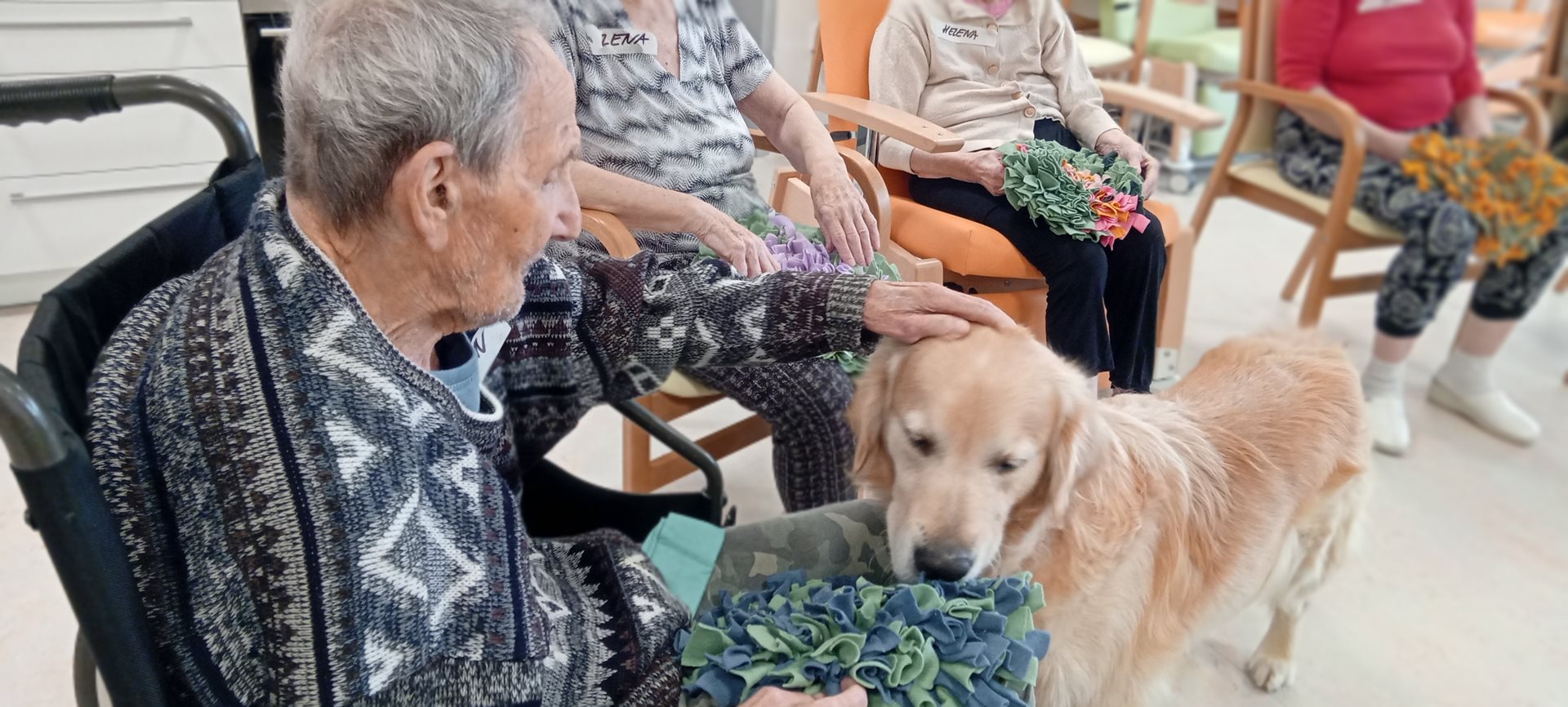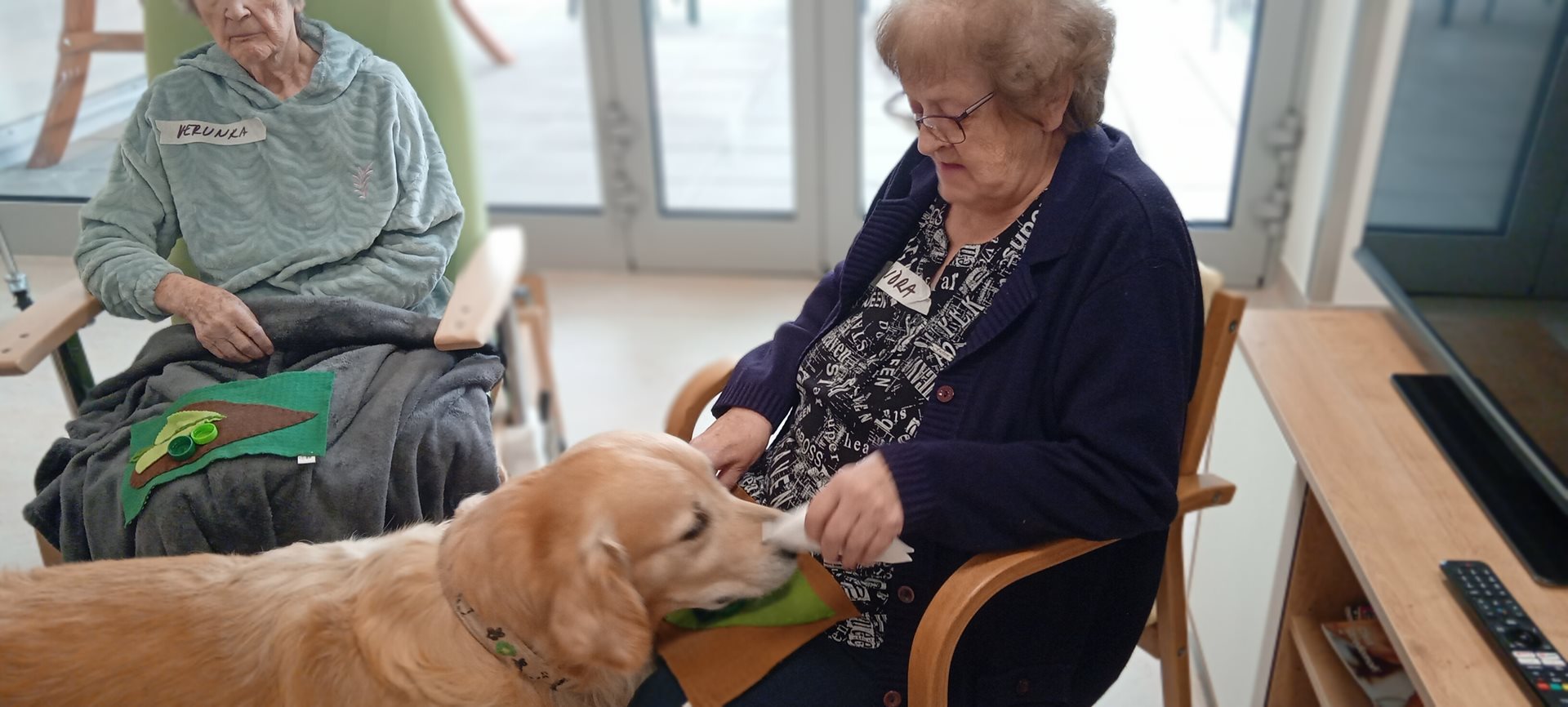 Během aktivit si klienti procvičovali jemnou motoriku, vzpomínali na svá zvířata a užívali si přítomnost psího kamaráda, kterého si rádi pohladí a nakonec ho i krásně učešou.