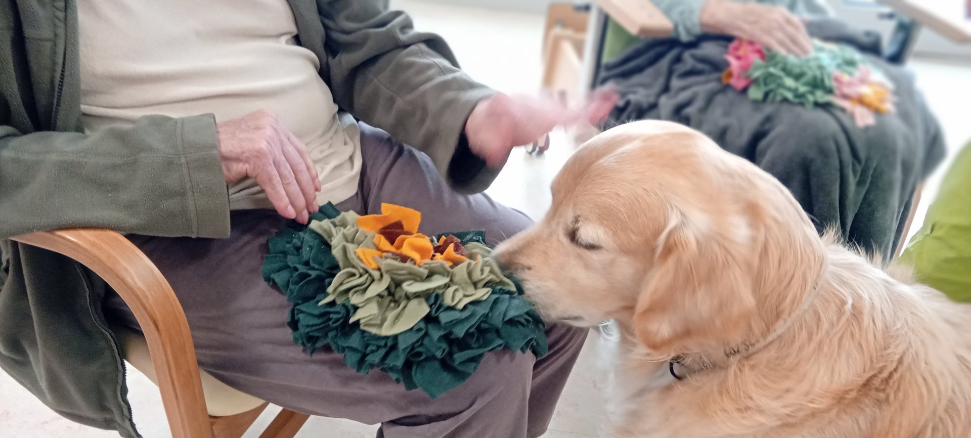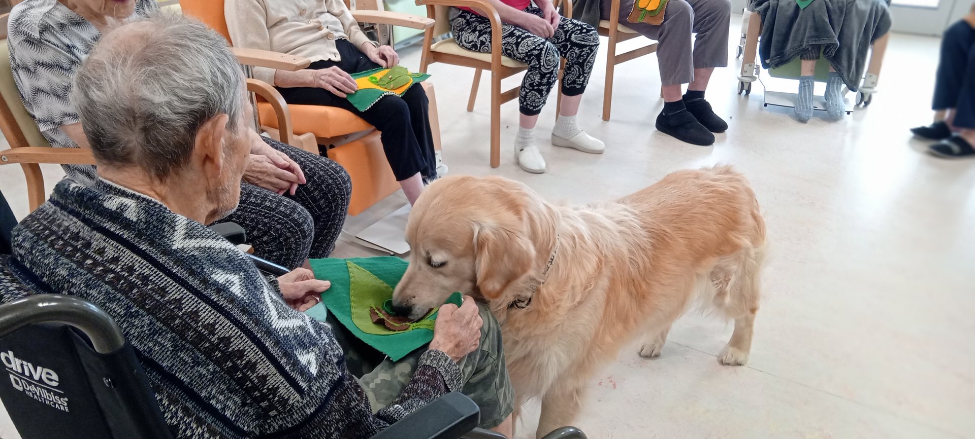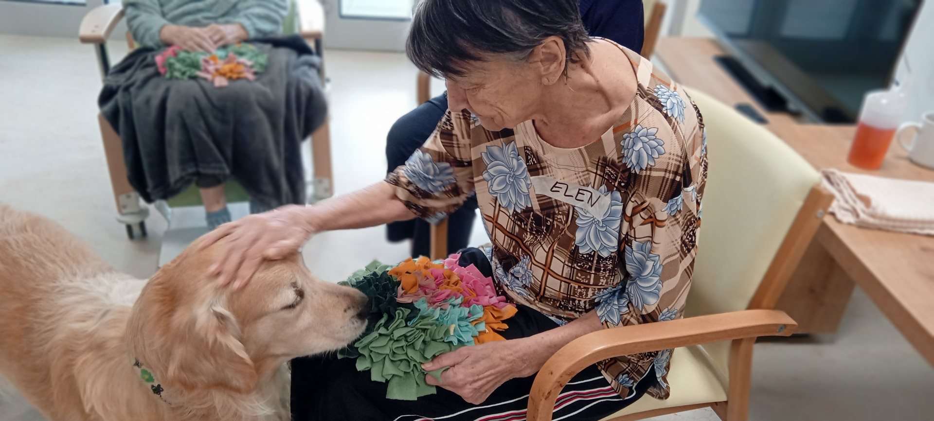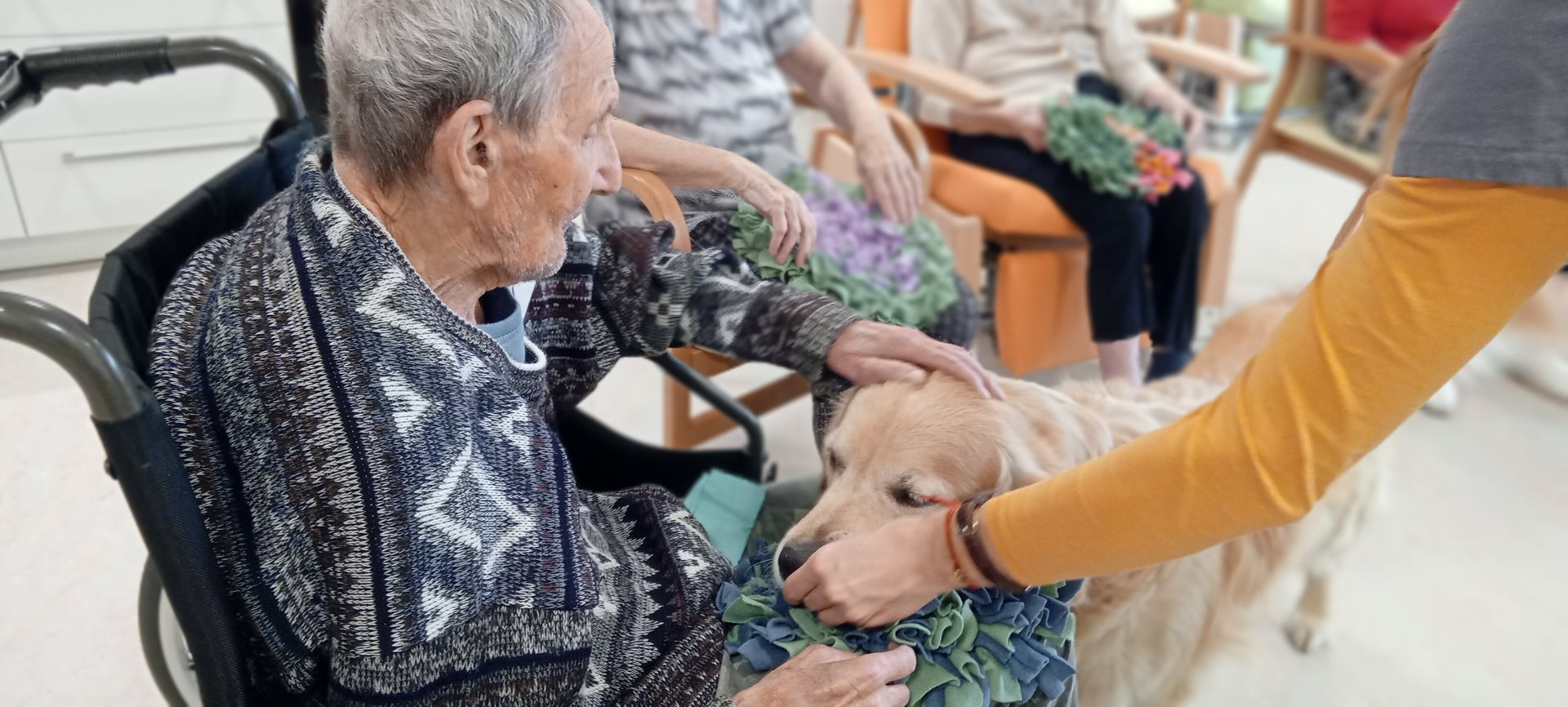 Během aktivit si klienti procvičovali jemnou motoriku, vzpomínali na svá zvířata a užívali si přítomnost psího kamaráda, kterého si rádi pohladí a nakonec ho i krásně učešou.