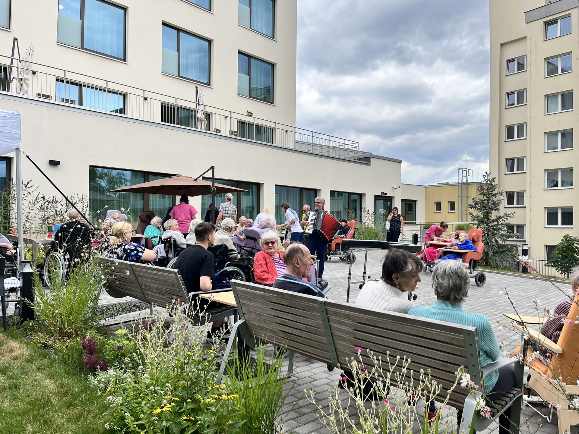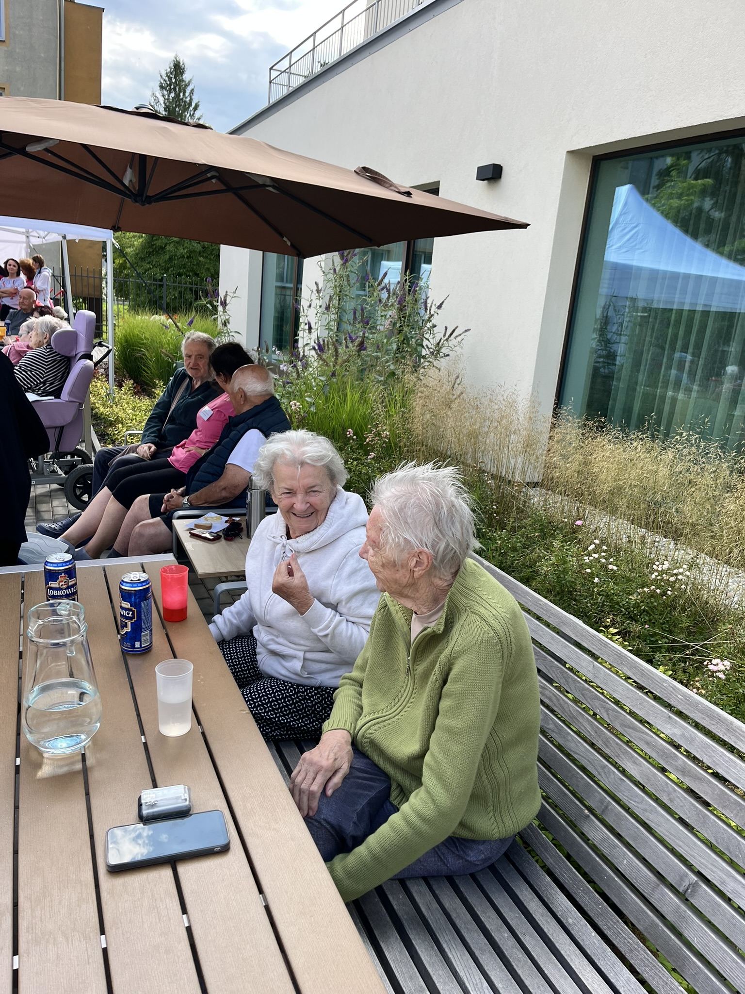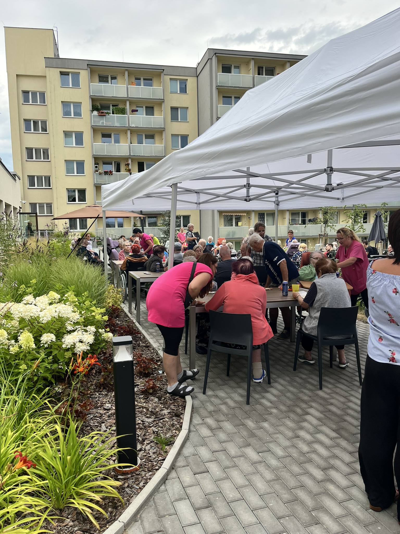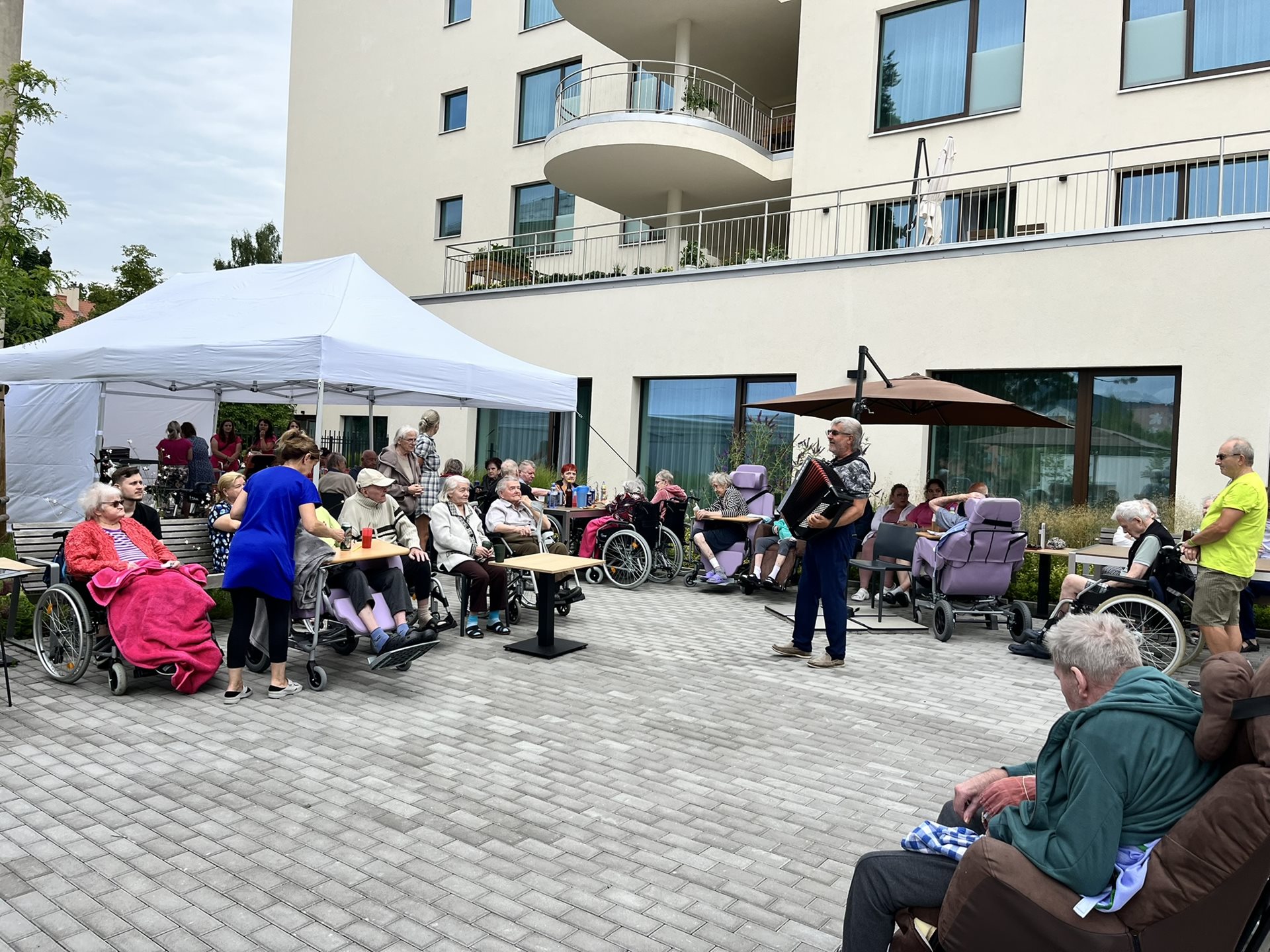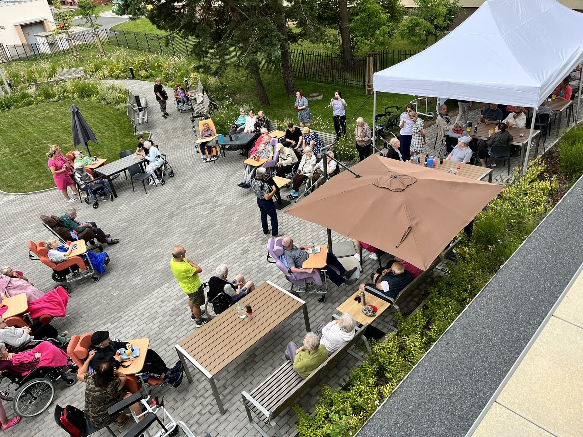 Celý tým domova se snažil o komfort našich klientů, střídavě vycházelo sluníčko nebo zase foukalo, takže se běhalo pro svetříky a deky, ale ohromně si to všichni užili.